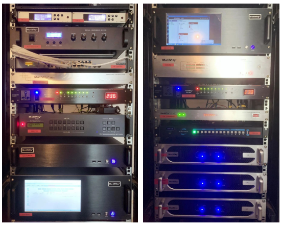 使用了一臺DP8080處理器,具有8路平衡輸入和8路平衡輸出,可擴展8路Dante輸入和8路Dante輸出,內置回聲消除、反饋抑制、壓縮、限幅、EQ,對前級和后級信號進行集中控制及處理。