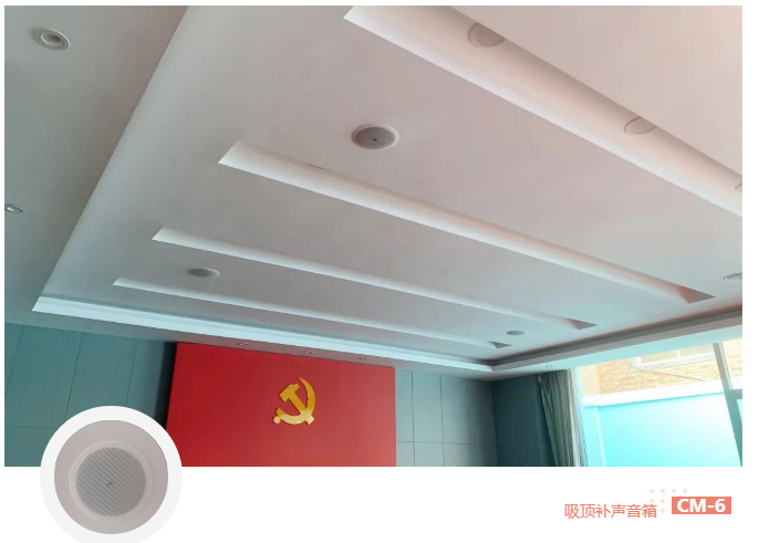 使用了兩只PAL83線性陣列音柱作為主擴音箱,嵌入式安裝于大屏幕兩邊,天花安裝了6只CM-6吸頂補聲音箱(分兩只一組,共3組),搭配3臺H1功放進行揚聲器功率放大。整體上既保證了現場擴聲均勻度,又能與環境融為一體,視覺上顯得