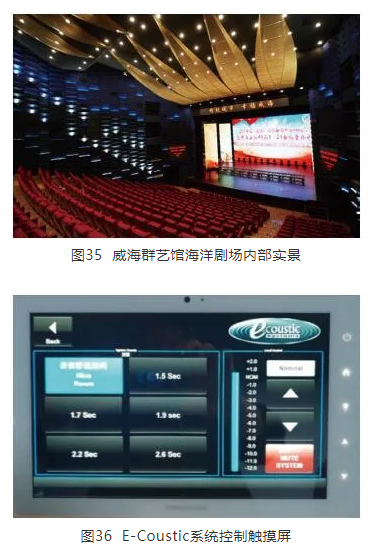 如前所述,E-Coustic系統基于世界最著名的專業混響器研發生產企業Lexicon而來,其獨到的混響算法為這種嵌入式系統提供了一個非常好的再生聽感,同時E-Coustic先進的時變技術,也很好地保證了系統的穩定性。本系統中,傳聲器與揚聲器的距離很近,但很好地抑制了聲反饋和聲染色的問題。同時系統使用較少的傳聲器-揚聲器通路,即能達到改變聲學環境的效果,也很大程度的降低了施工難度,這也是嵌入式系統的固有優勢之一。威海市群藝館海洋劇場內部實景及E-Coustic控制觸摸屏分別如圖35和圖36所示。