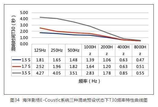 本項目總共進行了兩次調試,第一次調試完成后,客戶在使用過程中感覺混響時間不足以滿足廳堂所有的應用場景,故又根據客戶的需求進行了第二次調試,增長了混響時間。除了廳堂自身的固有聲學條件外,經歷了兩次調試的E-Coustic系統共設置了10個混響時間預設模式,分別為1.5 s、1.7 s、1.9 s、2.2 s、2.6 s、2.9 s、3.2 s、3.5 s、4 s和6 s,同時,還設置了一個對廳堂本身聲學問題進行一定程度修復的語音舒適模式。現場調試完成后選取了1.5 s、1.7 s及3.5 s預設進行了實地測量,T30的測量結果如圖34所示。此外,系統本身對初始時間間隙、早期反射聲、混響能量等聲學參數均可單獨調節,這也極大地豐富了系統的綜合調控能力,使整個聲學空間的真實感和內部參數間的適配度得以有效提升。
