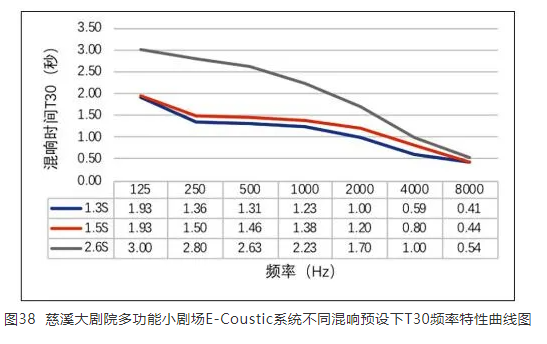 此項(xiàng)目在原有聲學(xué)條件的基礎(chǔ)上,最終調(diào)試完成并交付使用時(shí)共設(shè)有6種預(yù)設(shè)模式,其中Nice room模式下,E-Coustic系統(tǒng)主要用于早期反射聲的增強(qiáng),只加入了少量的混響聲能,使得廳堂在此模式下,擁有更高聲能量以及聲場(chǎng)均勻度,因此,同時(shí)提升了語(yǔ)言清晰度,適合會(huì)議、講座等場(chǎng)景使用。此外幾種模式的混響時(shí)間預(yù)設(shè)分別為1.3 s、1.5 s、2.6 s等,這些模式均可根據(jù)多功能小劇場(chǎng)不同的使用場(chǎng)景,通過(guò)觸摸式操作面板來(lái)進(jìn)行切換。本項(xiàng)目調(diào)試階段特地邀請(qǐng)了上海交響樂(lè)團(tuán)的弦樂(lè)四重奏來(lái)模擬正式演出場(chǎng)景,通過(guò)開(kāi)閉電子聲學(xué)環(huán)境可變系統(tǒng)的對(duì)比評(píng)價(jià),演奏者反饋聲學(xué)環(huán)境變化十分明顯,加載本系統(tǒng)后演奏中的廳堂感和交互感有了明顯的提升。本廳堂加載三種不同混響時(shí)間預(yù)設(shè)模式的T30實(shí)地測(cè)量結(jié)果如圖38。