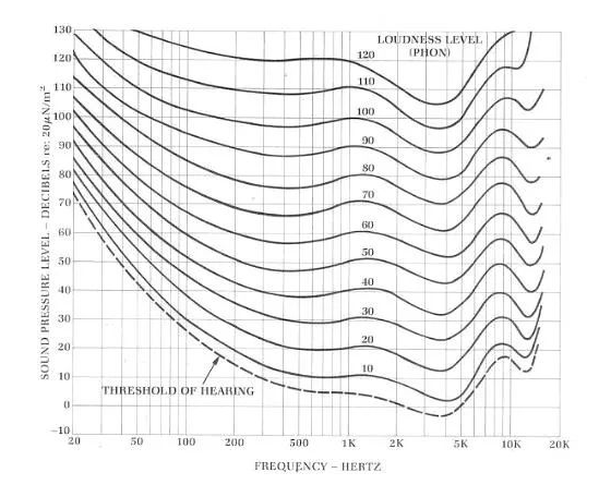 在進行聲壓級計算前,必須選擇一個相應(yīng)環(huán)境下合適的基準聲壓級,而基準聲壓級的選擇必須了解正常人耳的等響曲線,即“Fletcher-Munson curves(弗萊徹芒森曲線)”。