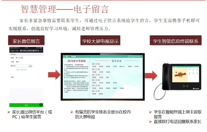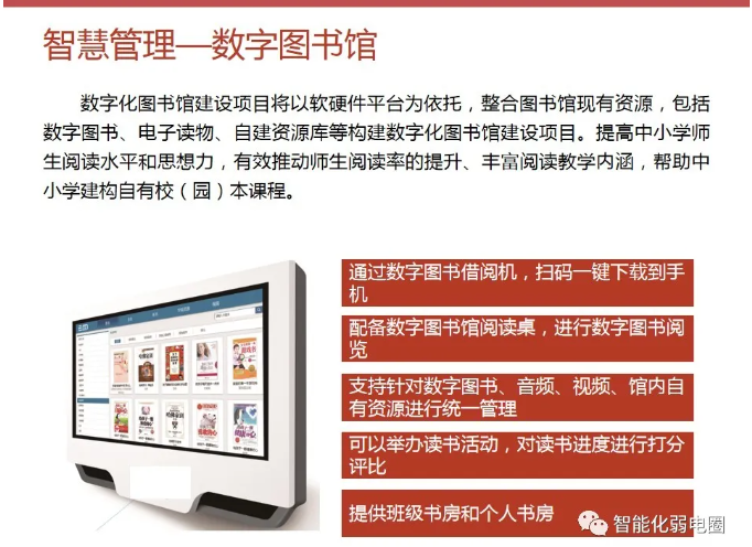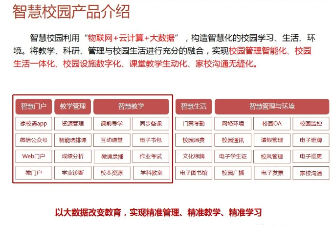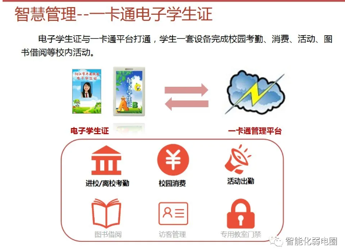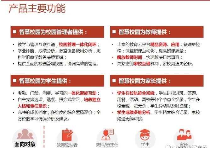 一套完整的智慧校園解決方案,不僅僅是校園傳統的智能化弱電系統建設,還包括智慧校園能為校園管理者、教師、學生、家長等各類角色提供服務。
