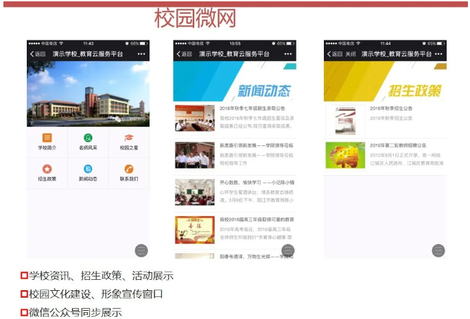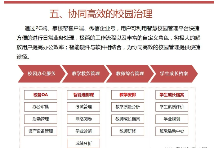 智慧校園為校園管理者提供,教學與管理互聯互通,校園管理一體化閉環,學業診斷、成績分析、教室設備使用分析;為教師提供豐富的教育云平臺,精品資源,備課更加輕松,更緊密的家校互通機制;為學生提供考勤、門禁、消費一體化智能互動,自主安排選課、選餐、探究式學習,完整的成長檔案,多維度素質評價;家長提供學生在學校軌跡知曉、學生進校、進班、答題、離校各個節點記錄;學生成績多維度分析,家校溝通無縫對接。