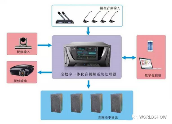 第三代:純數(shù)字架構(gòu)。在第一代和第二代音頻架構(gòu)中一般都需要配置的調(diào)音臺(tái)的功效非常強(qiáng)大,有時(shí)甚至強(qiáng)大到非專業(yè)人士無法操作的“牽一發(fā)而動(dòng)全身”的境地。同時(shí),隨著社會(huì)化的發(fā)展,人力成本的提升,專門的“音響師”崗位無法滿足社會(huì)的需求。同時(shí),討論型會(huì)議室的大量出現(xiàn),調(diào)音臺(tái)的作用無法滿足其現(xiàn)場操作的需求。同時(shí),復(fù)雜的模擬連接方案也不適應(yīng)現(xiàn)在會(huì)議系統(tǒng)的需求。因此,出現(xiàn)了全數(shù)字架構(gòu)的音頻矩陣技術(shù)。從話筒輸入,到最后全部處理完成的音頻信號輸出,全部音頻信號的處理、復(fù)制、傳輸?shù)拳h(huán)節(jié)都在一臺(tái)或多臺(tái)數(shù)字設(shè)備的數(shù)字技術(shù)內(nèi)完成,僅有一次AD/DA轉(zhuǎn)換,因此稱之為第三代音頻架構(gòu):全數(shù)字化架構(gòu)。特別是全開放結(jié)構(gòu)的數(shù)字化產(chǎn)品,系統(tǒng)的核心價(jià)值已經(jīng)由完全的硬件采購部分轉(zhuǎn)移到了軟件拓?fù)涞亩伍_發(fā)上。編程開發(fā)人員的水平重要性已經(jīng)超越了設(shè)備的價(jià)值。當(dāng)然,所帶來的缺陷是現(xiàn)場操作的臨場手感沒有了。不過也不算可惜,現(xiàn)在的會(huì)議環(huán)境已經(jīng)不需要音響師現(xiàn)場調(diào)音了。